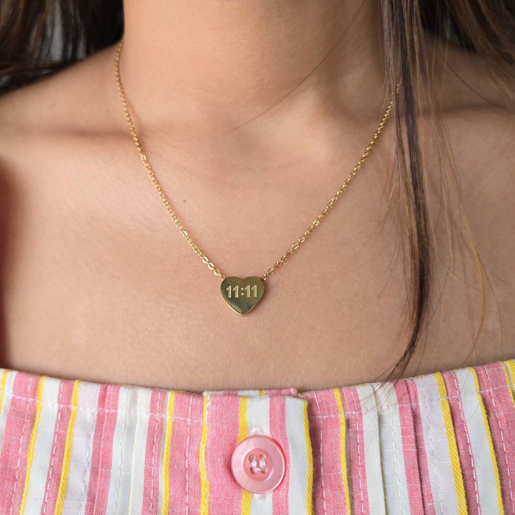 A golden reminder of synchronicity and self-belief, this heart-shaped necklace engraved with “11:11” captures the magic of divine timing. Known as the wish hour, 11:11 symbolizes alignment, manifestation, and moments that feel meant to be. Dainty yet meaningful, this piece is perfect for layering or wearing solo as a daily affirmation close to your heart.