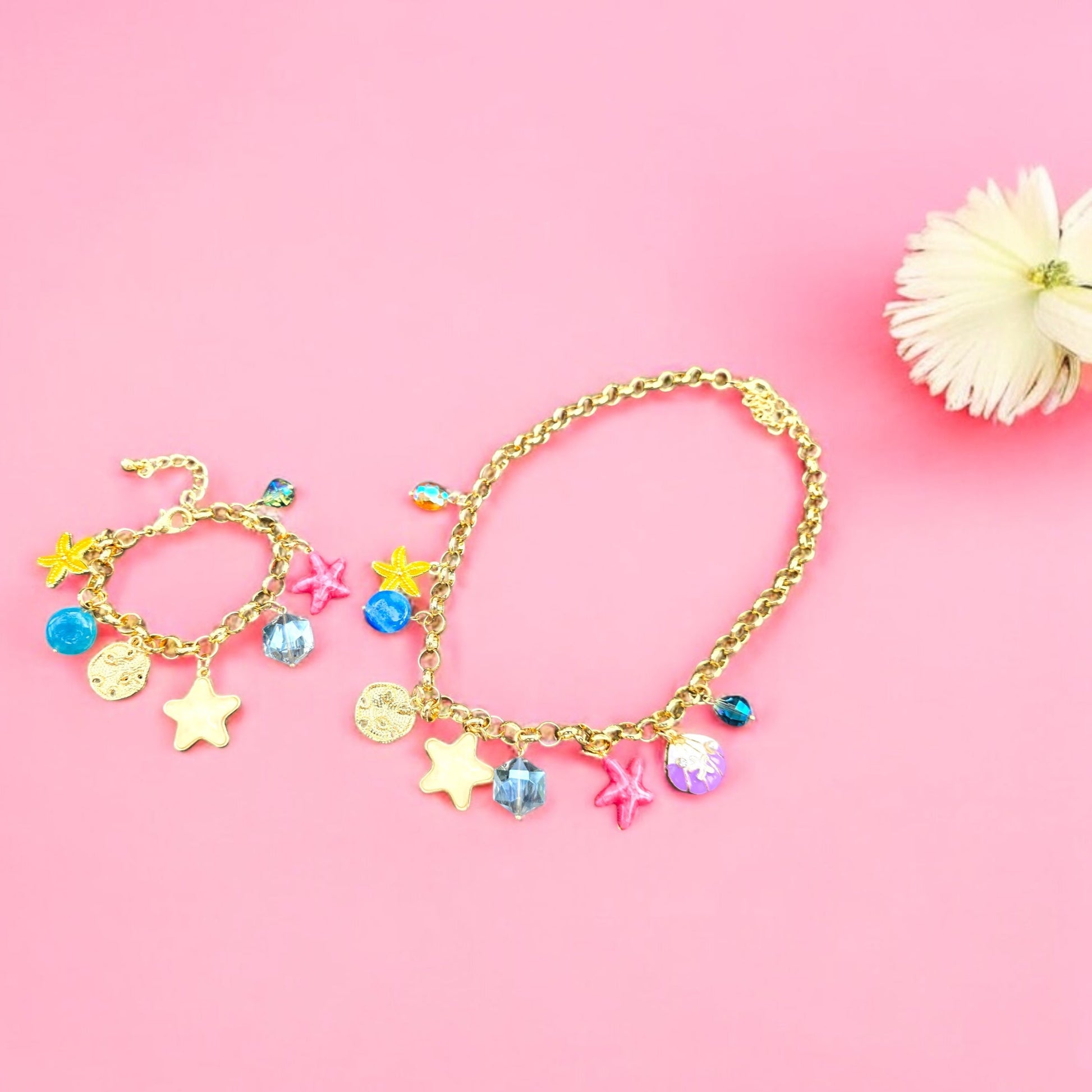 Add a splash of colour to your day with this playful charm set—featuring vibrant starfish, ocean crystals, and whimsical seaside accents in a gold-tone finish.