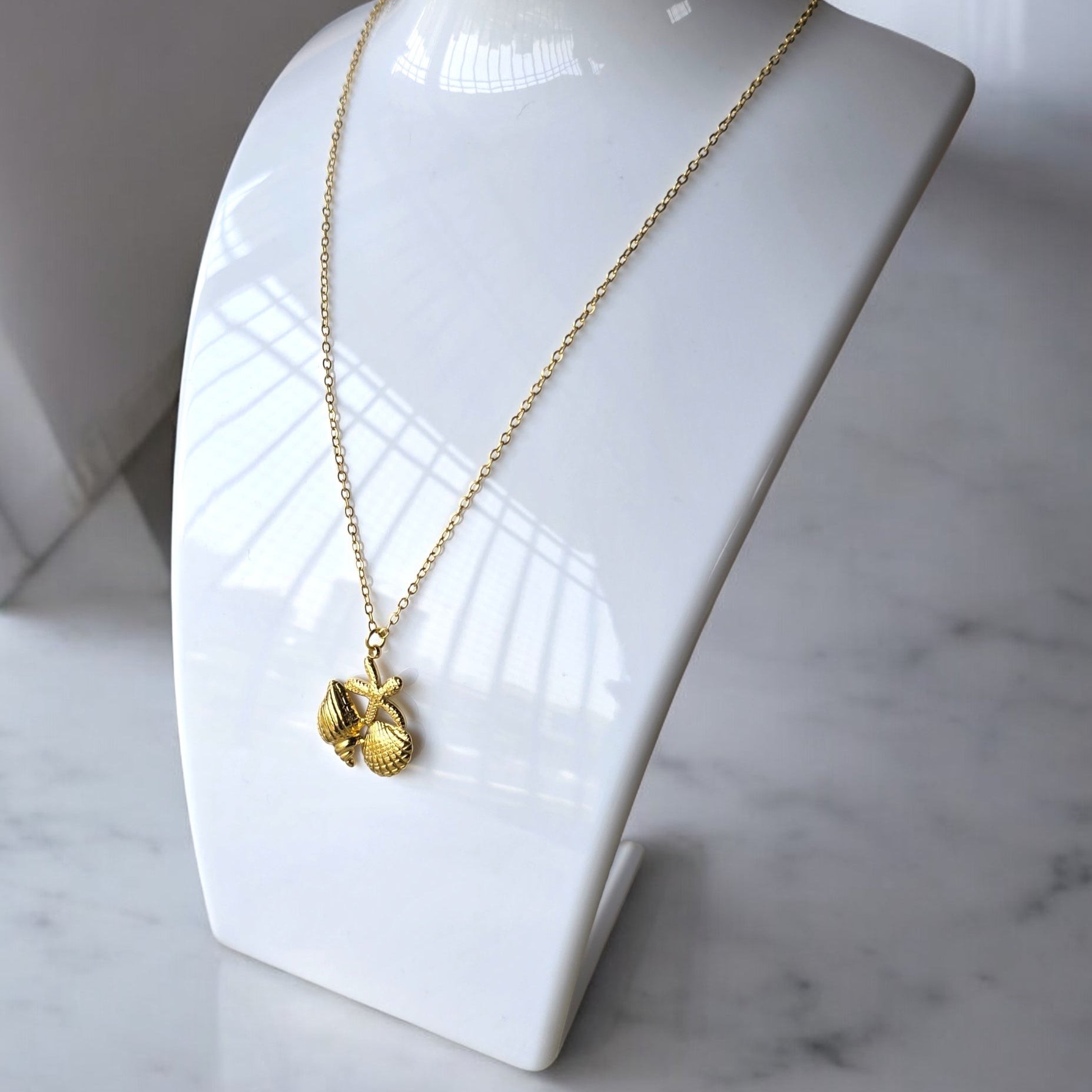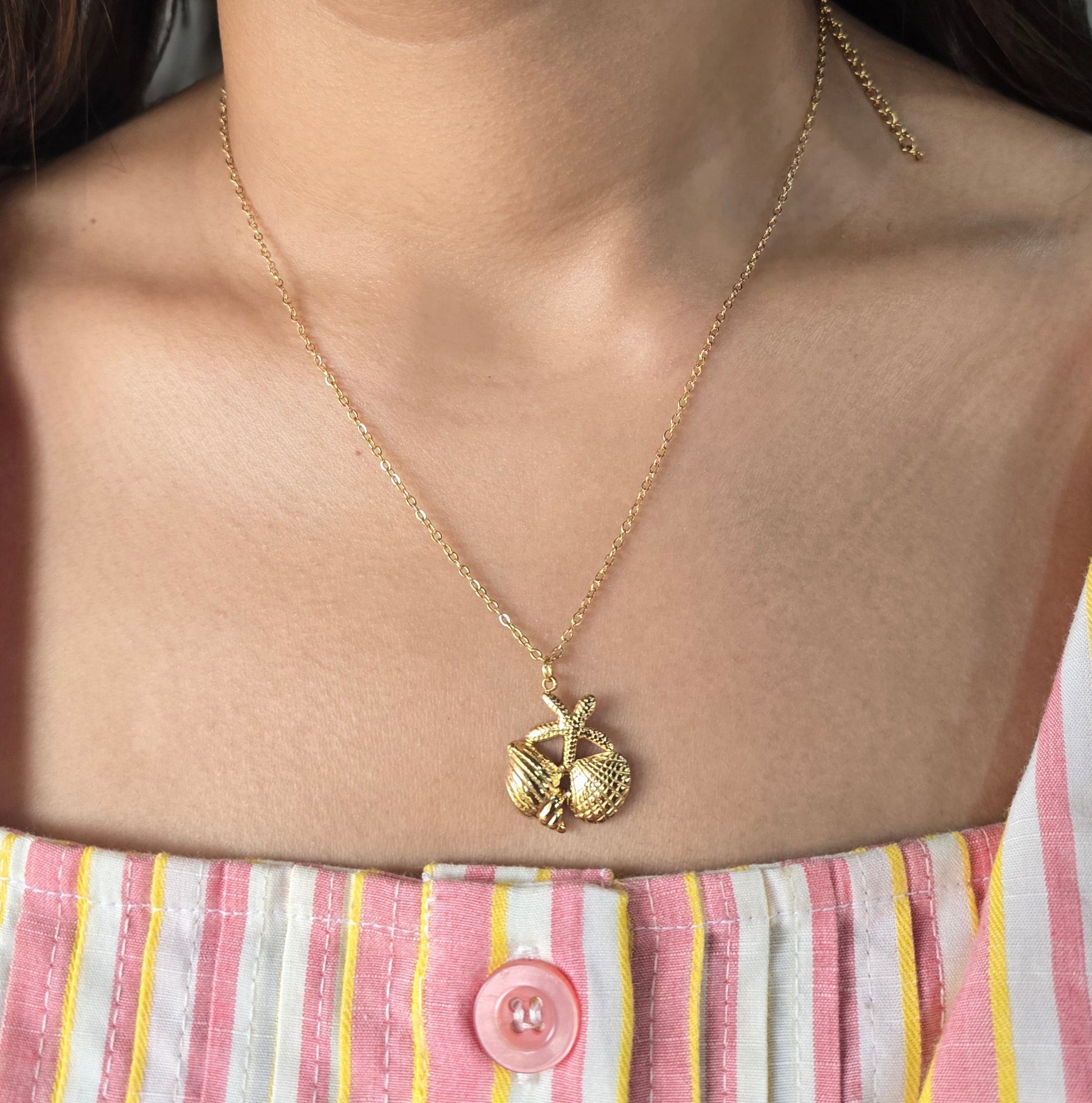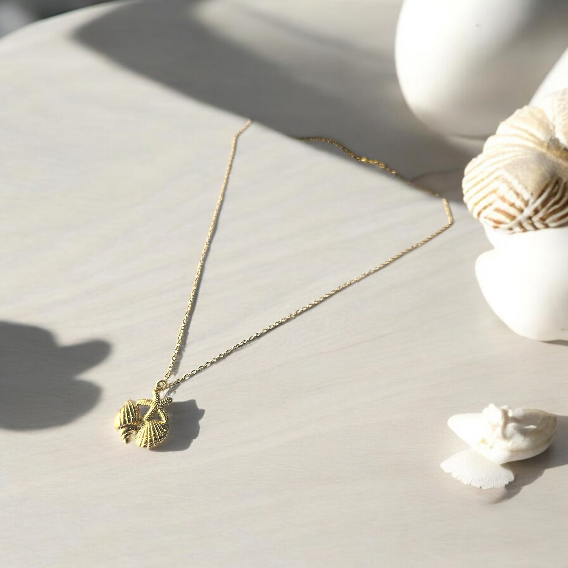 Inspired by coastal elegance, this gold necklace features a beautifully detailed essence of seaside serenity and charm. A symbol of femininity and hidden treasures, it’s the perfect piece to carry a touch of the ocean wherever you go. Lightweight, unique, and full of character, this necklace brings summer vibes all year round.