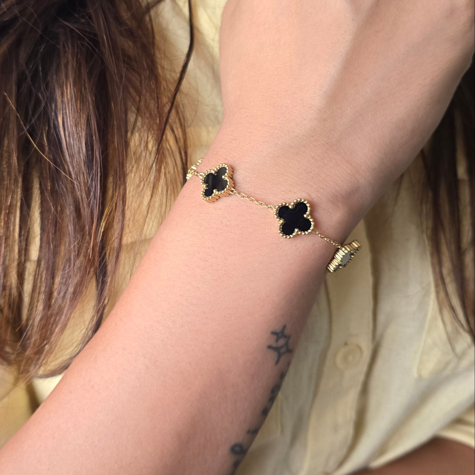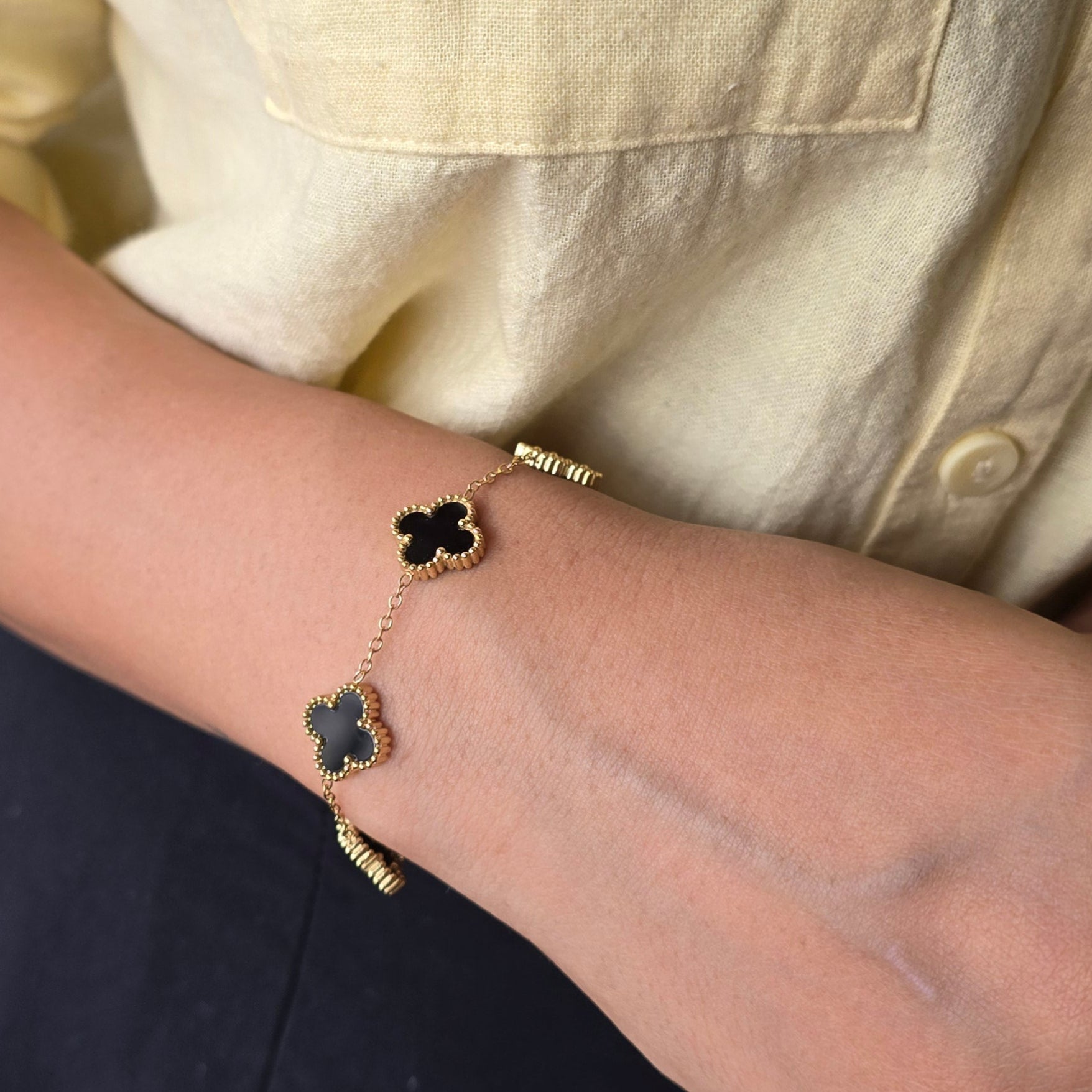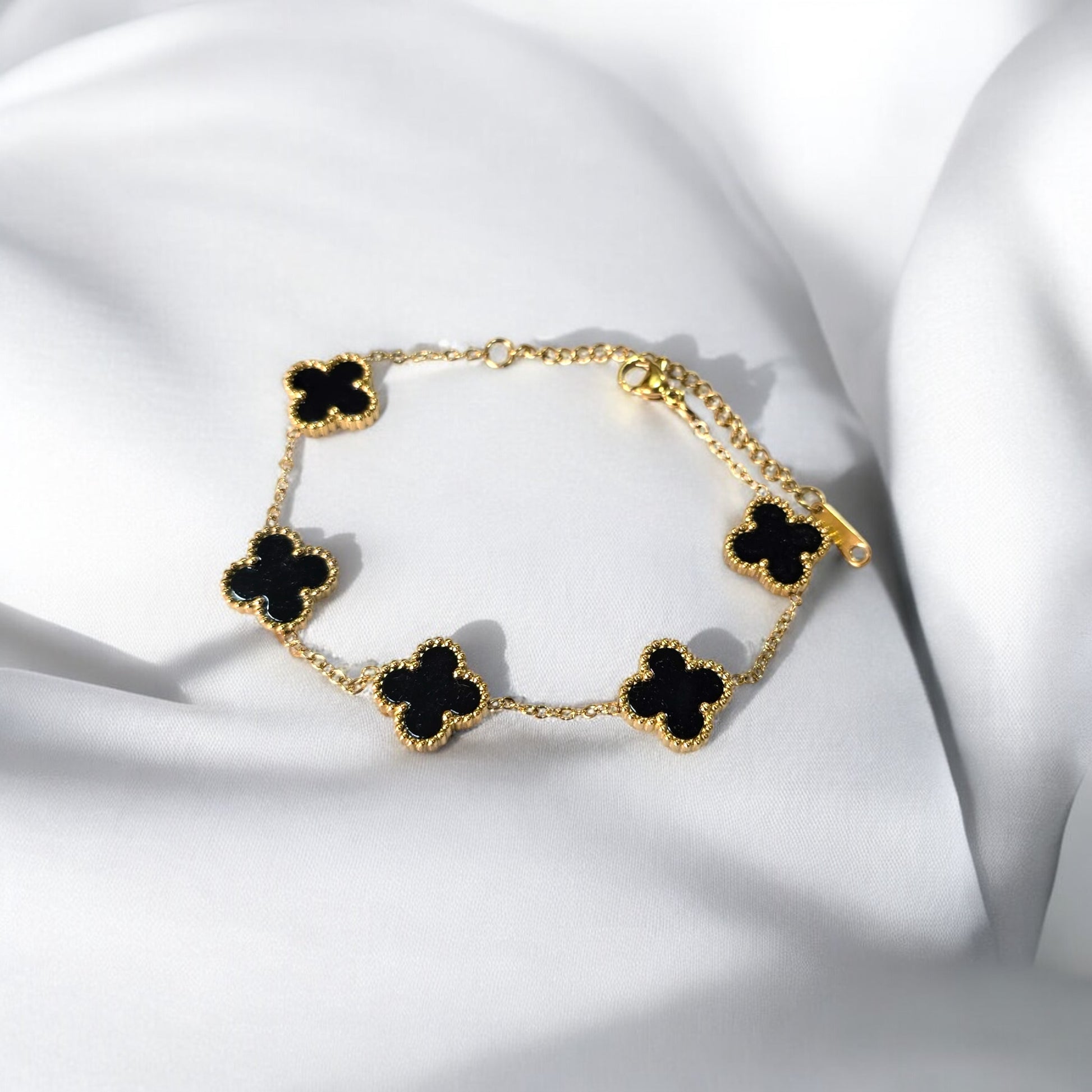 Bold, timeless, and effortlessly chic—this black clover bracelet is the epitome of modern elegance. Featuring five jet-black clover charms outlined in rich gold beading, it exudes confidence and mystery. Whether you’re dressing up for a night out or adding edge to your daytime look, this bracelet brings a refined touch of drama that never goes out of style.