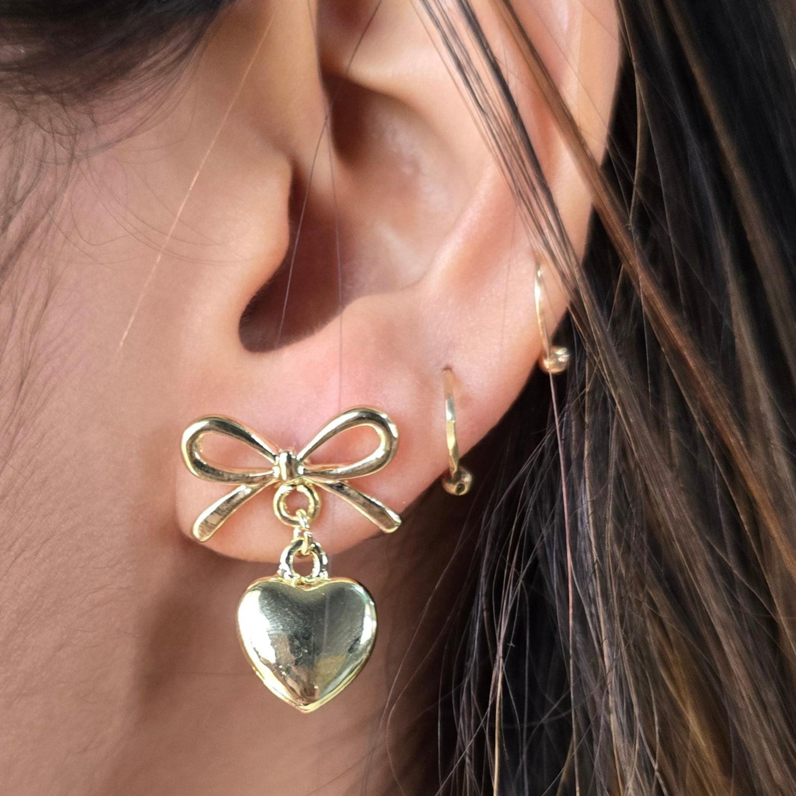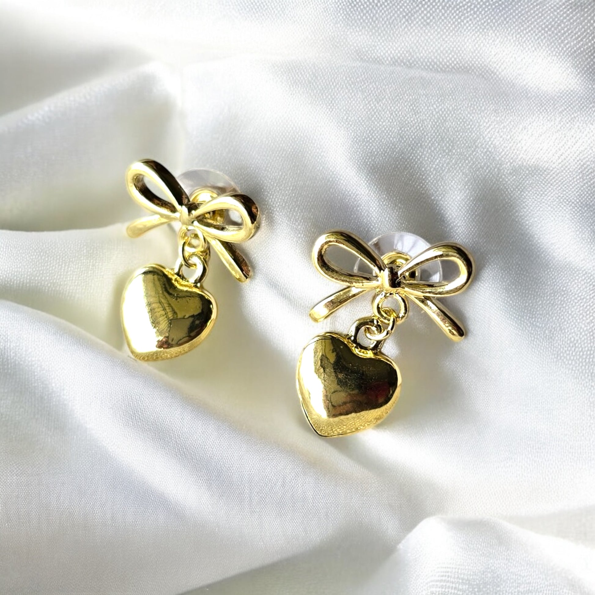 A cute golden bow holding a shiny heart charm — the perfect touch of love and elegance for your everyday looks.