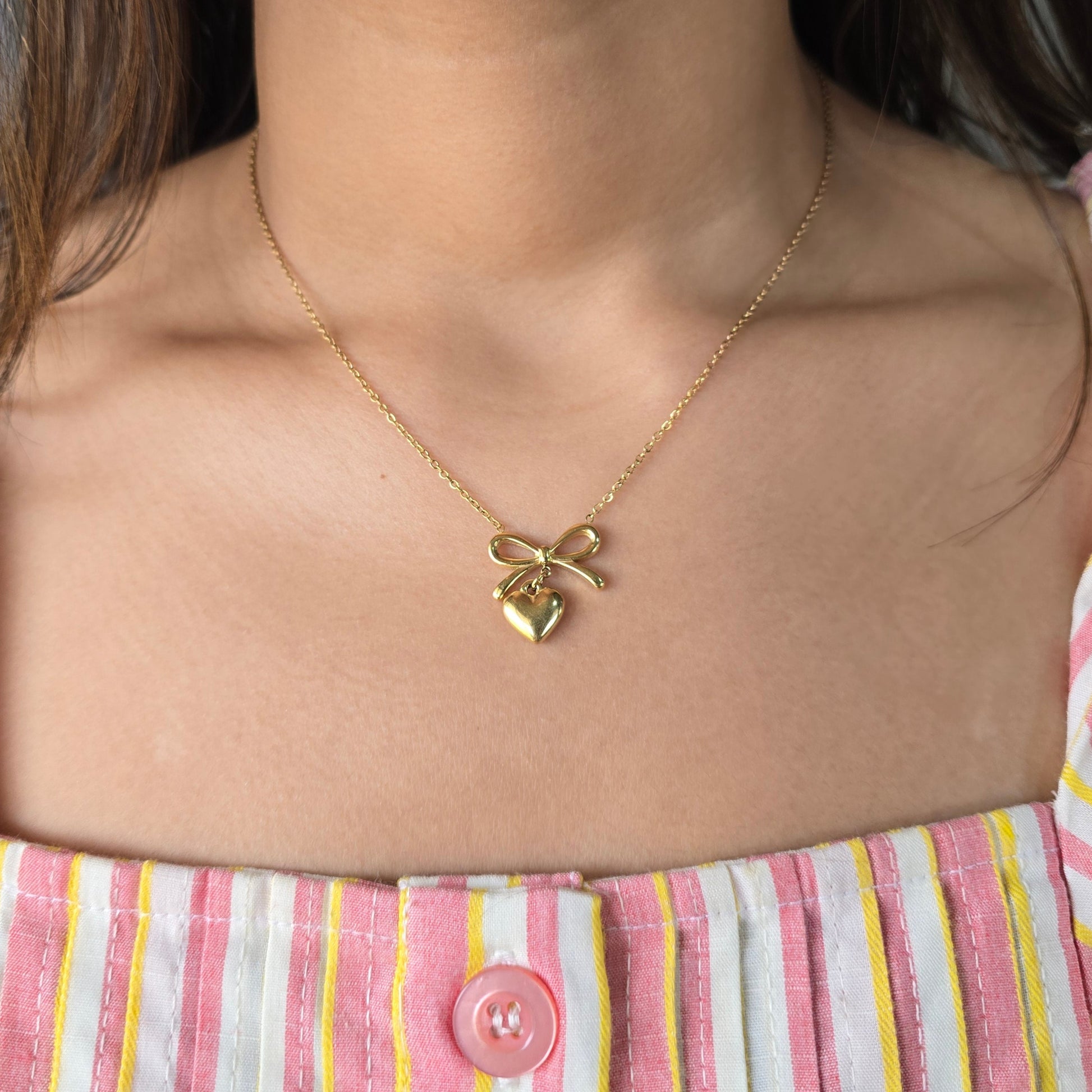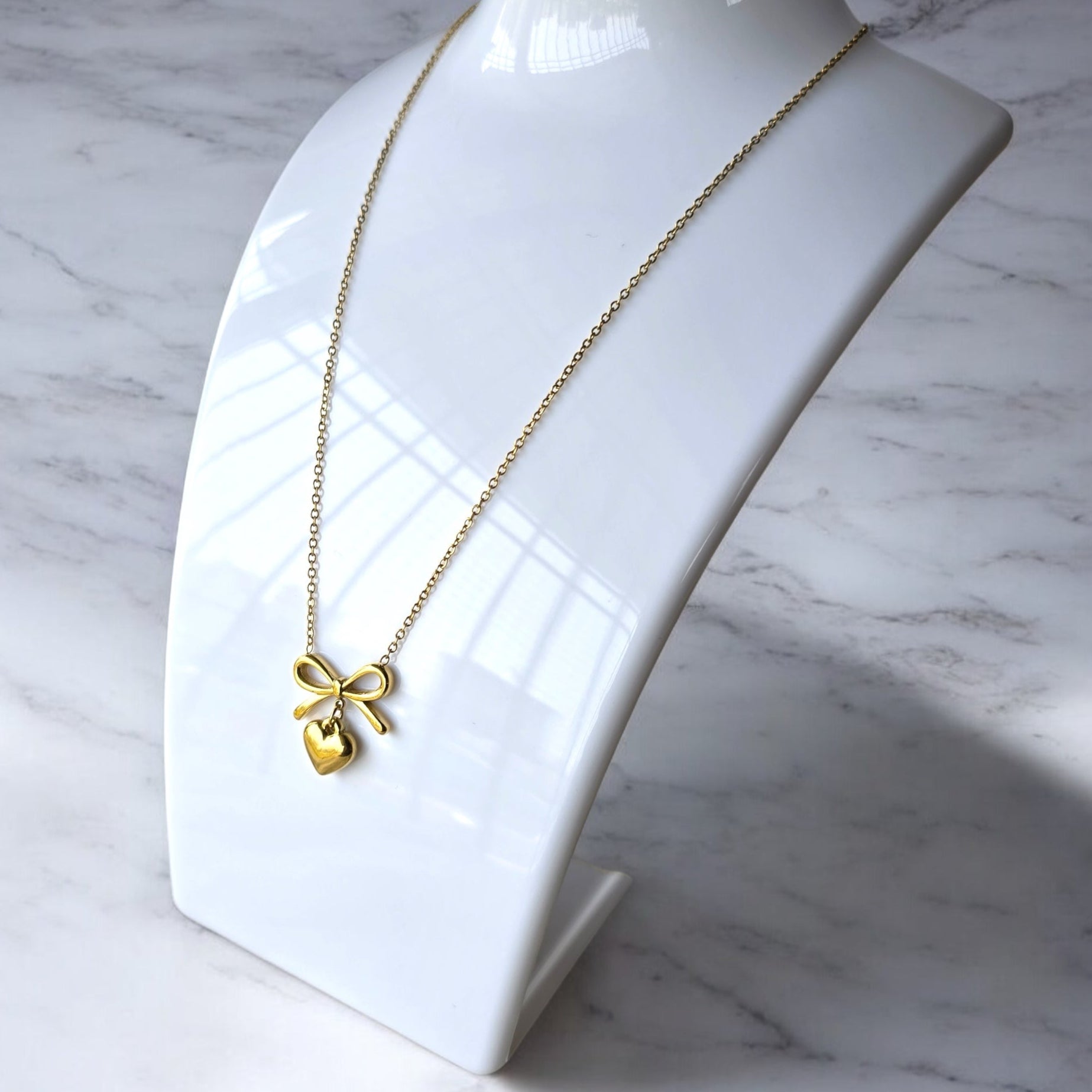 Delicately designed to capture the essence of sweet affection, this gold necklace features a dainty bow paired with a dangling heart charm—like a gift wrapped in love. Feminine, graceful, and full of meaning, it’s the perfect piece to celebrate love, milestones, or simply to add a touch of warmth to your everyday style.