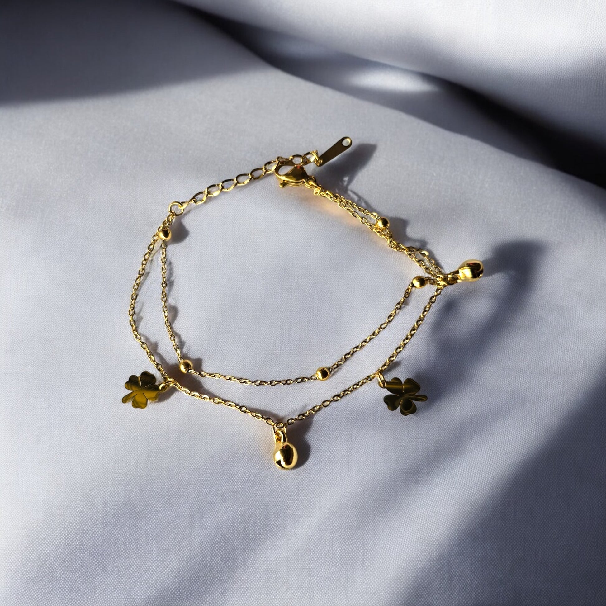Delicate yet striking, our Daisy Luck Bracelet features dual-layered gold chains adorned with black and white enamel clover charms — symbols of luck, beauty, and grace. The perfect piece to wear solo or stack up, it effortlessly adds charm to any look.