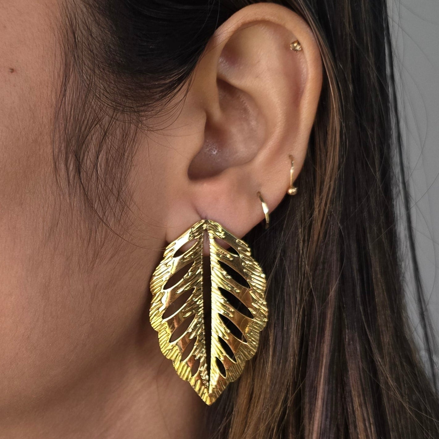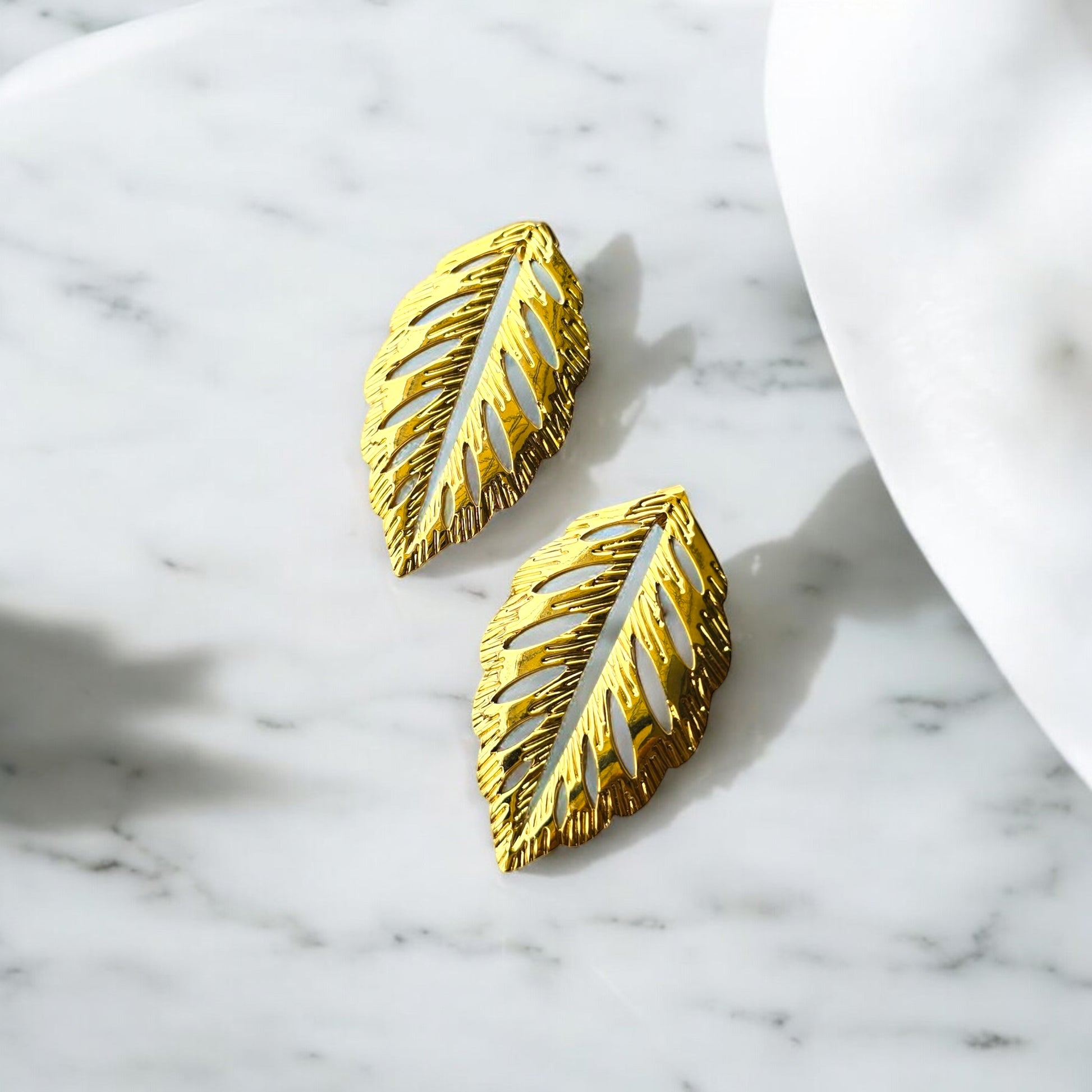 Elevate your everyday glam with these exquisite gold-toned glitzy leaf earrings — a perfect blend of nature-inspired elegance and bold design. The sleek cutout details mirror the natural veins of a leaf, while the high-shine finish adds a luxe touch. Lightweight yet statement-worthy, these earrings bring effortless sophistication to both casual and festive looks.