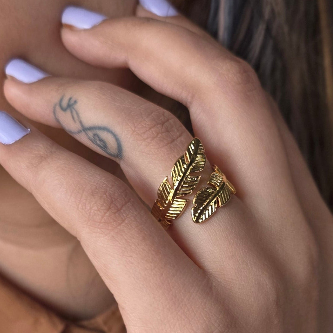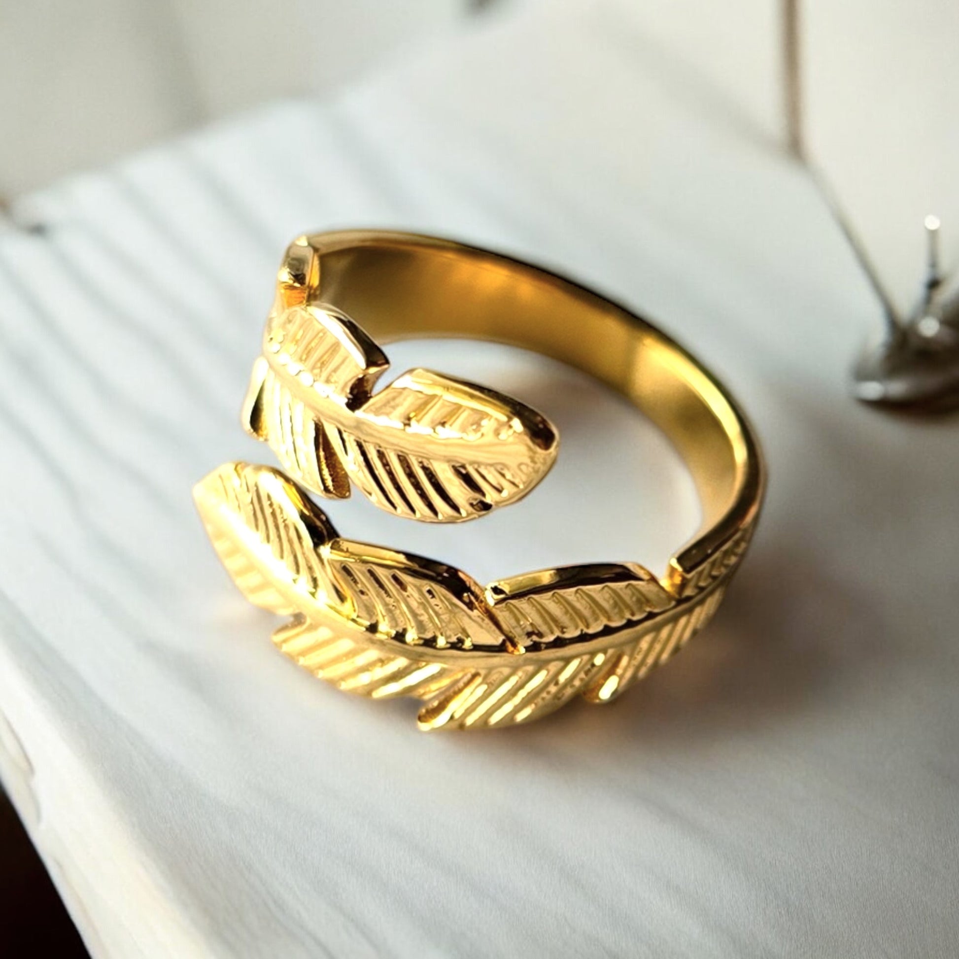 A symbol of effortless elegance, the Golden Plume Ring is inspired by the delicate grace of feathers. Crafted in a lustrous gold finish, its intricate detailing wraps your finger in lightness and charm. Whether worn solo or stacked, this ring adds a touch of freedom, strength, and natural beauty to your everyday look.