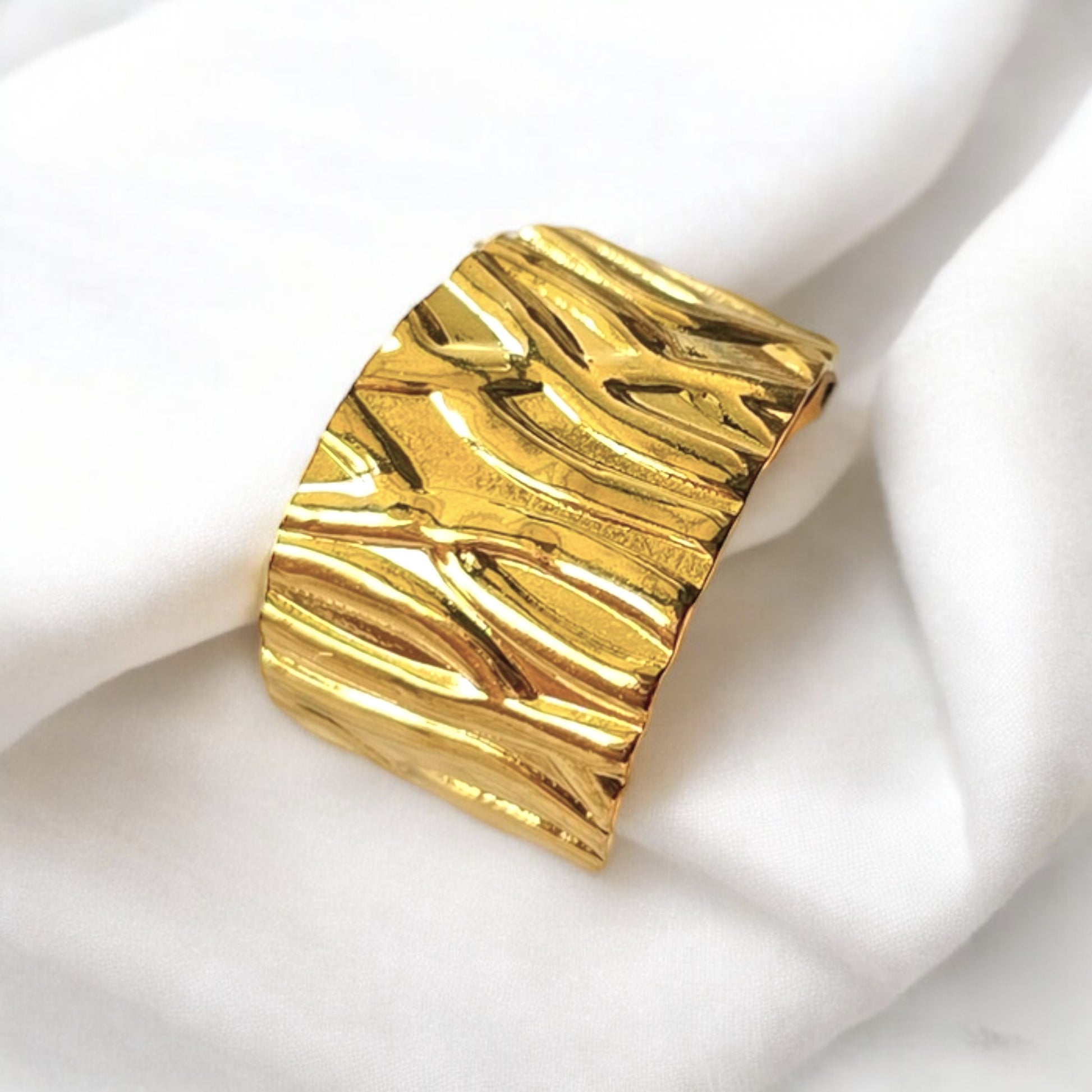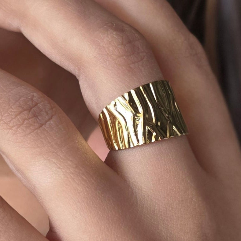 Make waves with the Raw Radiance — a bold textured ring inspired by nature’s raw flow. Its high-shine gold finish and ripple-like surface bring depth, drama, and a dose of golden glam to any look.