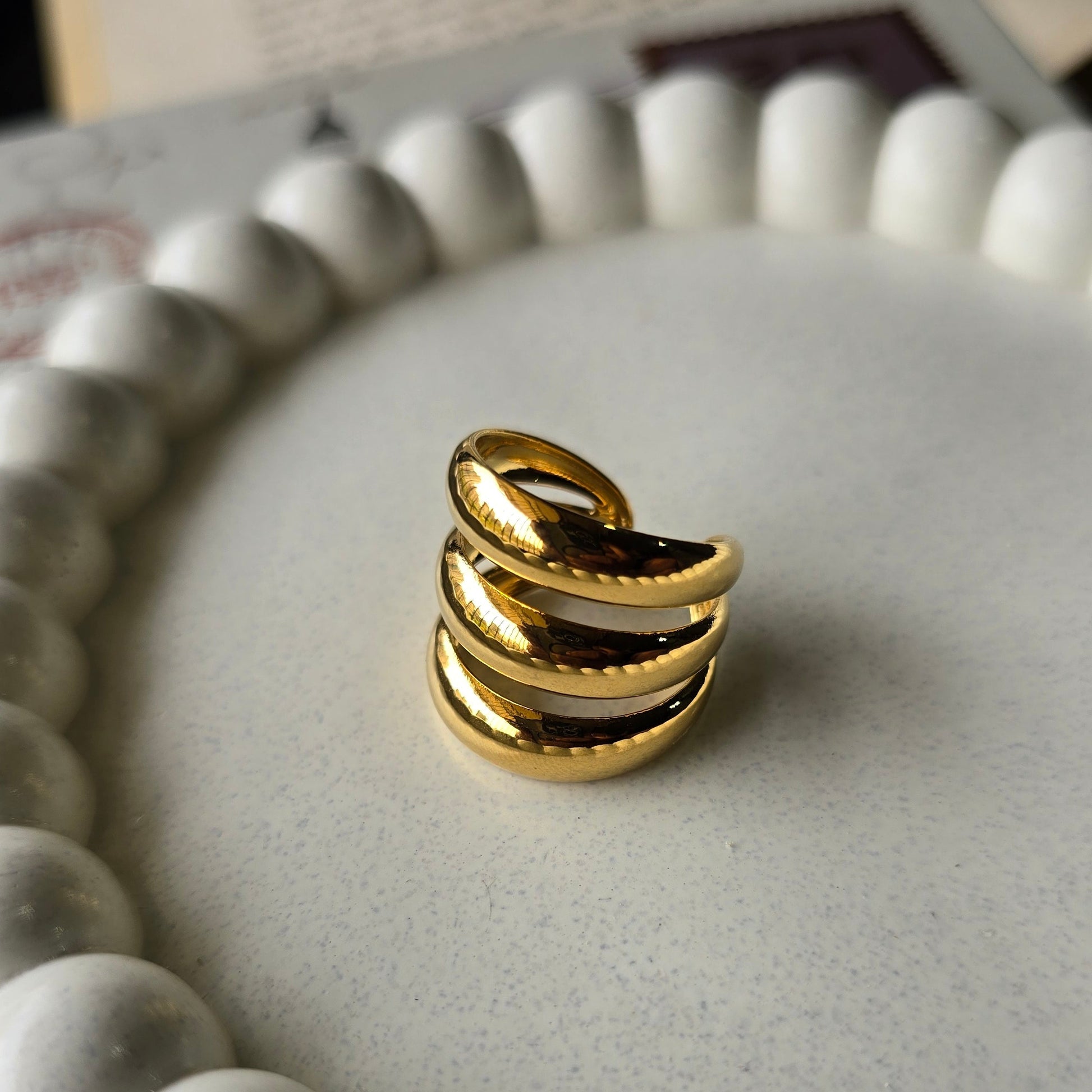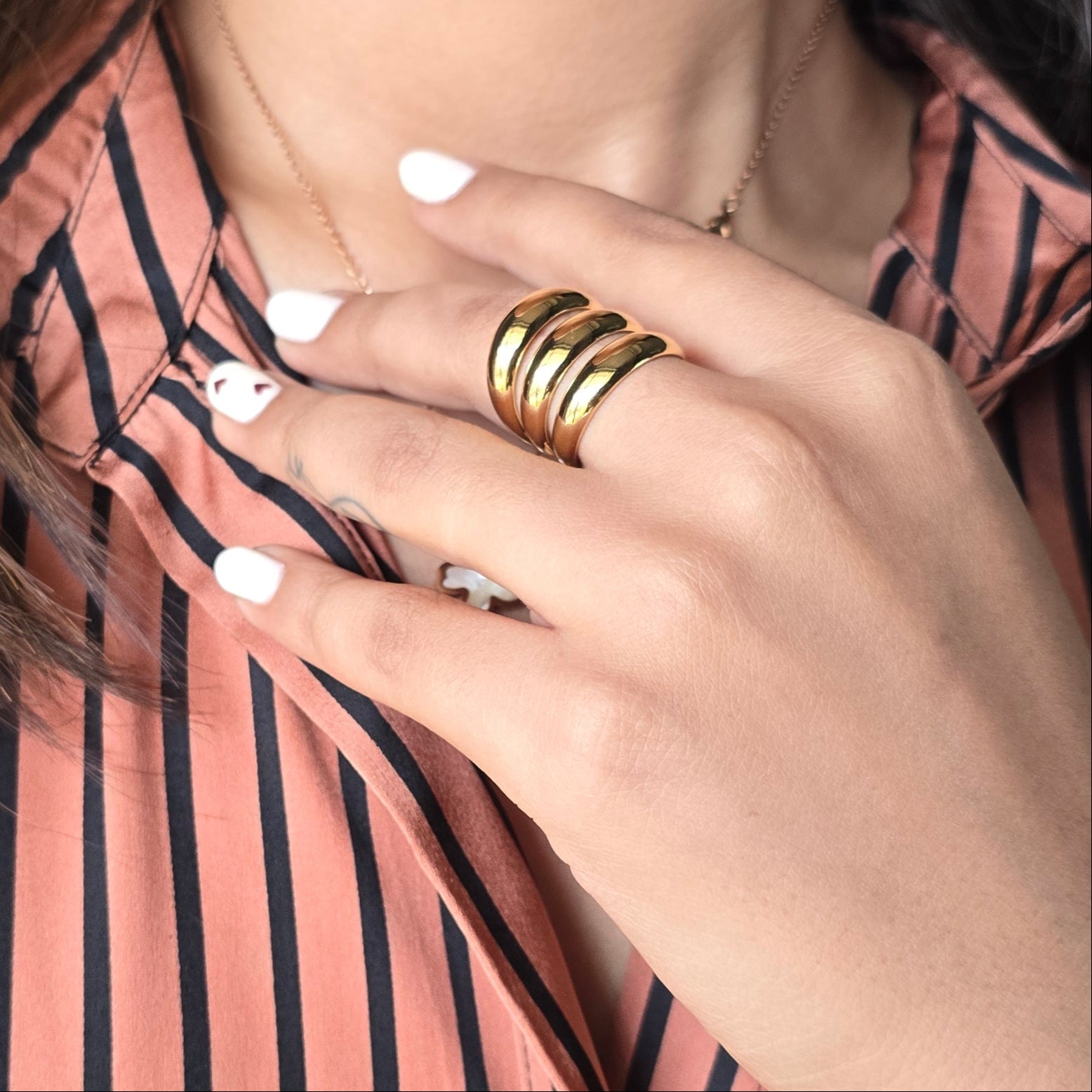 Three layers of bold, glossy gold stacked ring brings all the shine and statement you need in just one piece.