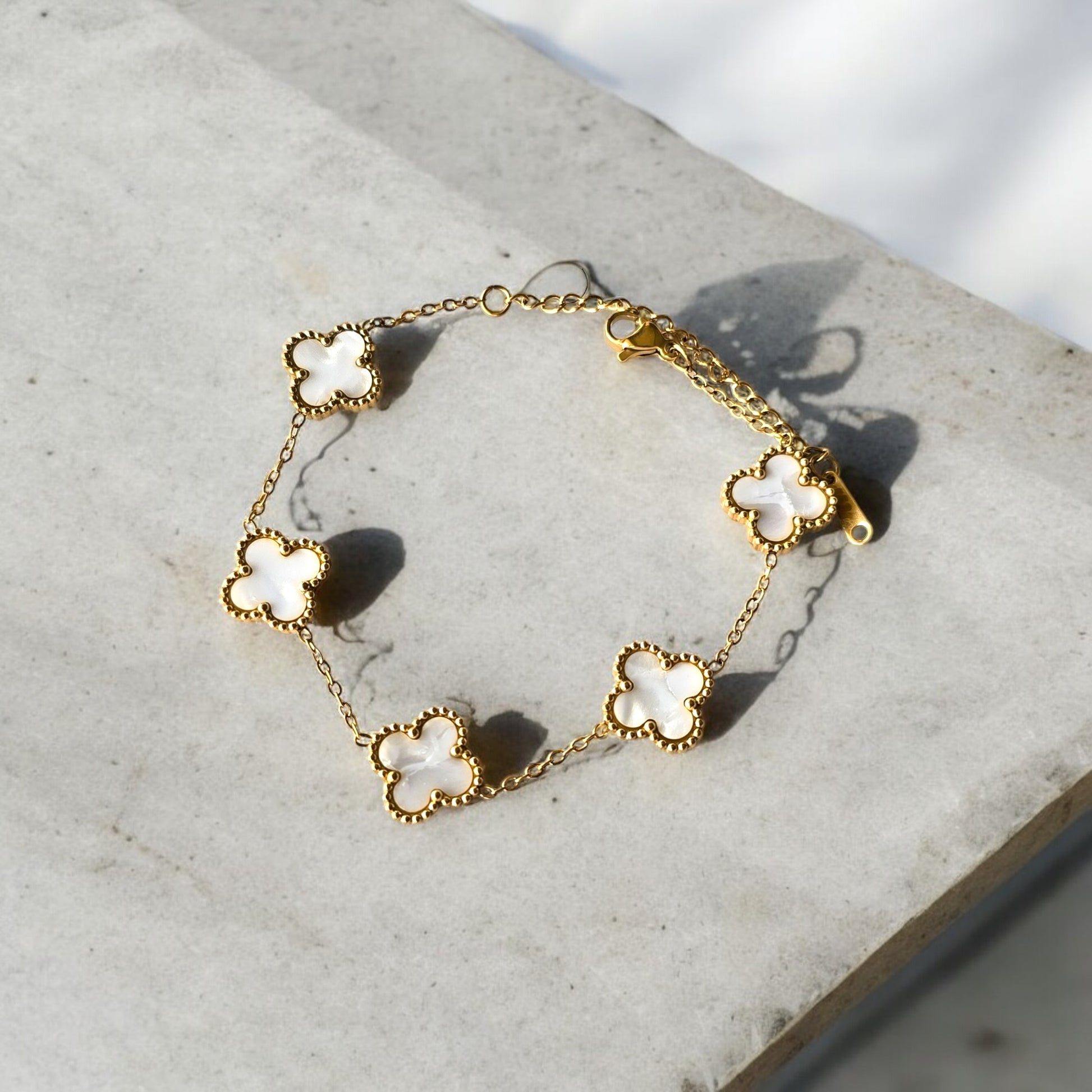 Elevate your everyday elegance with this white clover bracelet. Featuring five lustrous white clover motifs framed in a delicate gold chain, this piece blends minimalism with a hint of luxe. Perfect for stacking or wearing solo, it’s a symbol of luck and effortless grace—your go-to accessory for both casual charm and refined style.
