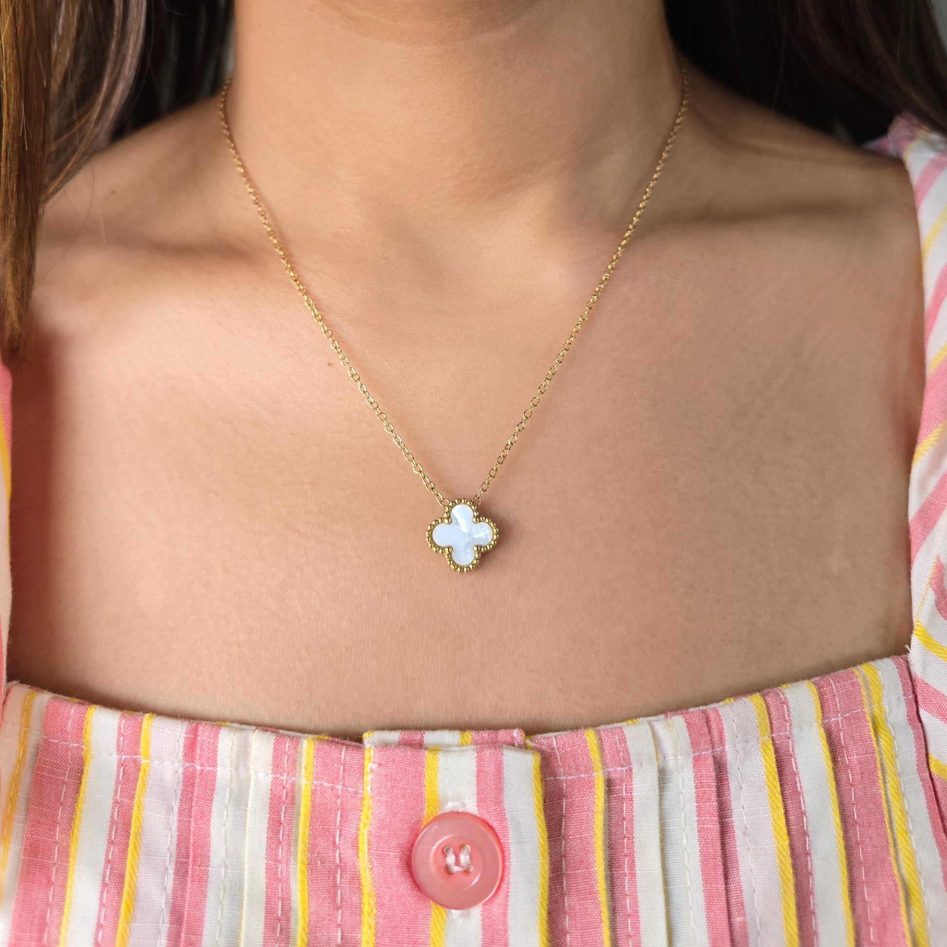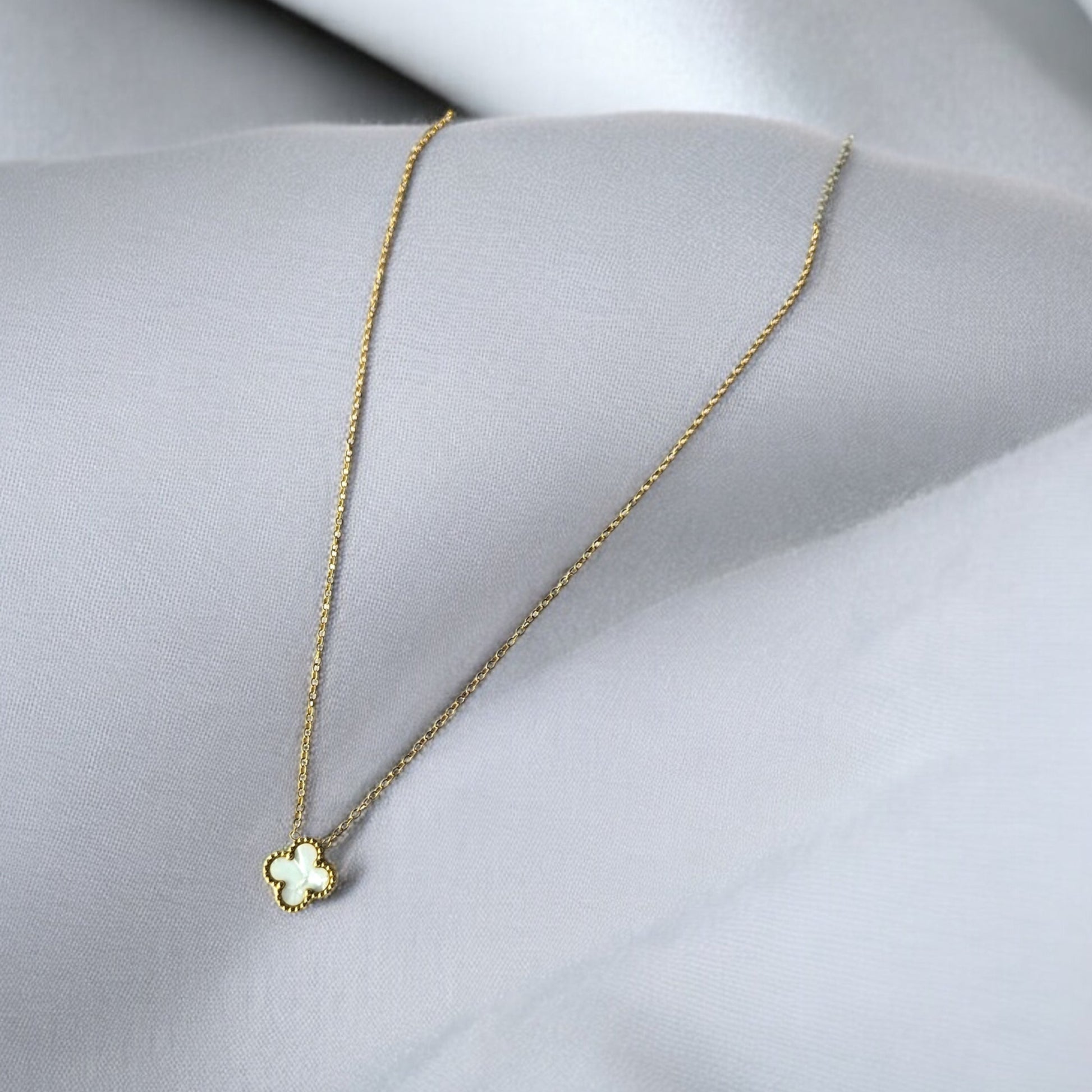 Radiating grace and subtle charm, this white clover pendant necklace is a symbol of purity and positivity. Set in a delicate gold frame, the mother-of-pearl inspired finish glows softly against the skin, making it a perfect everyday staple or a meaningful gift. Its timeless four-leaf design adds a whisper of luck and elegance to every look.