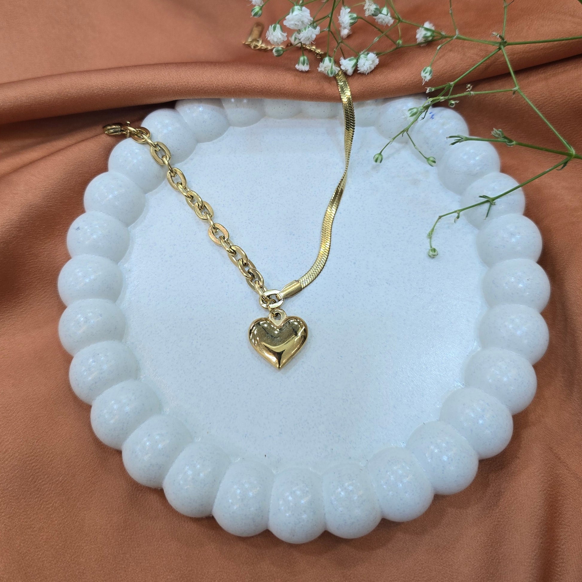 A dainty gold charm bracelet with s puffed heart charm- sweet, chic, and full of love.